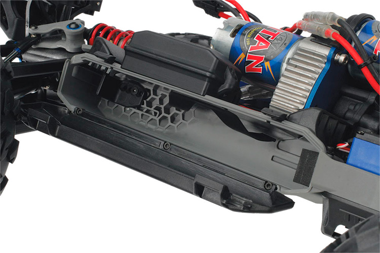 E-Revo comes Ready-To-Race® with 16.8 volt power capacity in the proven EVX-2™ power system. Dual Titan® 550 motors deliver on-demand torque for wheels-up launches and top speeds over 30mph on two 7-cell NiMH battery packs. The EVX-2 is equipped with our exclusive Training Mode™ feature that limits full-throttle power to 50%. In Training Mode, you can let friends who have never driven a radio controlled model try their hand with a E-Revo, worry-free. Three drive profiles, low voltage detection, thermal shutdown protection, gold-plated connectors, and incredibly low resistance are all features you might expect to only be available on an expensive replacement ESC. Fully waterproof electronics are a Traxxas exclusive that opens the door to new driving adventures on rain-soaked terrain.