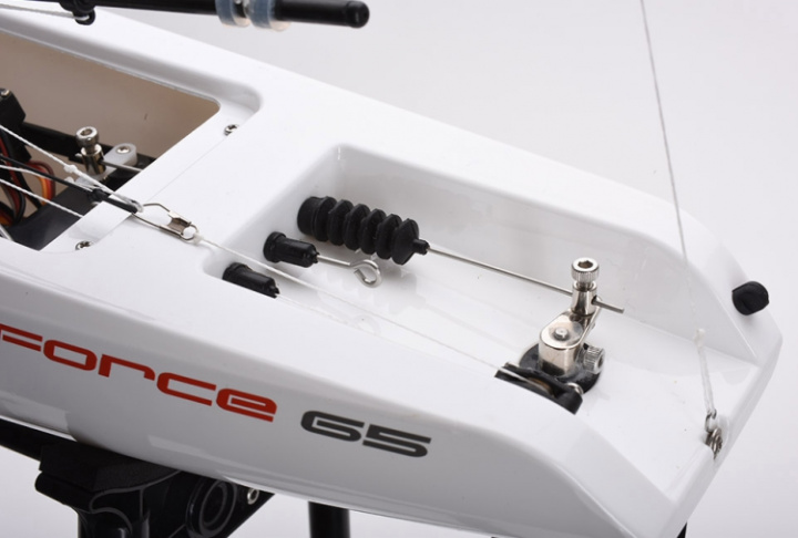 The new updated (6:th version) Dragon Force 65 sailboat. The DragonForce 65 has undergone a major transformation to bring the quality and appearance up the high standard set by its bigger brother the DragonFlite 95, without affecting the competitiveness of previous versions. New tooling for the hull sees an increase in hull strength (retaining the same shape and weight). Key rig fittings, the Gooseneck, Compression Strut, Masthead Fitting and Jib Boom front end fittings are new designs for maximum efficiency and easier assembly. The sails are now made from 50 micron Mylar film in a clean new style. The digital rudder servo also gets a 10% boost in torque and improved electronics. This truly is a stunning and race winning boat - straight out of the box!Specifications: