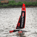 The hulls and cross beams are molded from plastic ensuring that they are precise, lightweight and tough. The booms and masts are made from carbon fiber and two mainsails are included; one for standard use and one for use in high winds. A plastic molded stand is included for easy maintenance and storage.