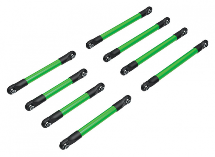 Suspension link set, 6061-T6 aluminum (green-anodized) (includes 5x53mm front lower links (2), 5x46mm front upper links (2), 5x68mm rear lower or upper links (4))Take your TRX-4M™ to the next level by replacing the standard suspension links with these heavy-duty aluminum links. Made from high-grade 6061-T6 aluminum, these suspension links take a beating and look great doing it. Links come assembled and ready to mount with rod ends and steel hollow balls. Includes 4x53 mm front lower links (2), 4x46 mm front upper links (2), and 5x56 mm rear upper and lower links (4).