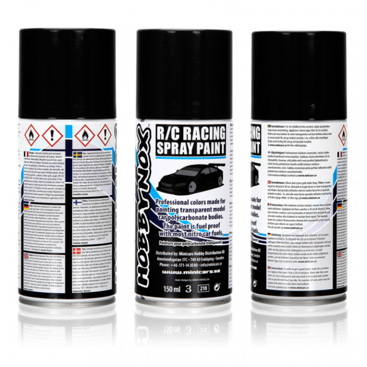 We're back on the Lexan® / Polycarbonate paint market - now with a series of 150 ml spray cans in the popular colors of today. Ready to use, quick drying, fuel resistant and light weight paint for racing.Hobbynox™ R/C Racing paint have been specially developed for the painting Polycarbonate bodies. The special solvent used in it etches the surface, allowing the paint to bond permanently with the bodyshell.