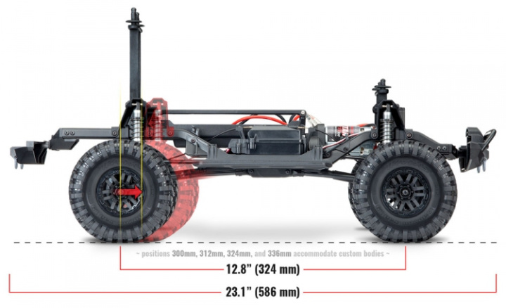 The TRX-4 Scale and Trail Crawler is equipped right out of the box with Traxxas' game-changing portal axle set. Portal axles lift the truck at the wheels for huge center pumpkin ground clearance. In order to achieve the same clearance with straight axles (and not get stuck), your tires would have to be over an inch taller than the TRX-4's tires. Straddling boulders with ease, the TRX-4 chassis definitely takes the path less travelled and simply leaves all the others behind.