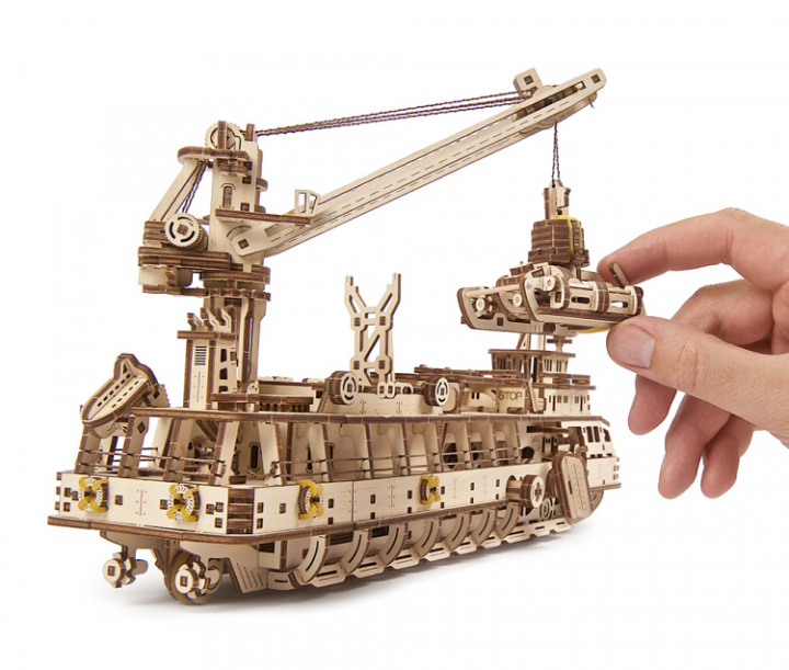 All details of the Research Vessel are made of high-grade eco-friendly wood that need no glue or additional instruments to assemble. The “skeleton” design of the Vessel’s body allows you to look into the hold and engine room and see what makes her move. The energy driving the model is produced by a rubber-band motor and managed by a pendulum. A clever gear arrangement in this block imitates the sound of a diesel engine and provides a smooth and steady pace of the Vessel. The model has three movement modes – forward, turn, and automatic manoeuvring. The modes are controlled with a lever you can switch manually.